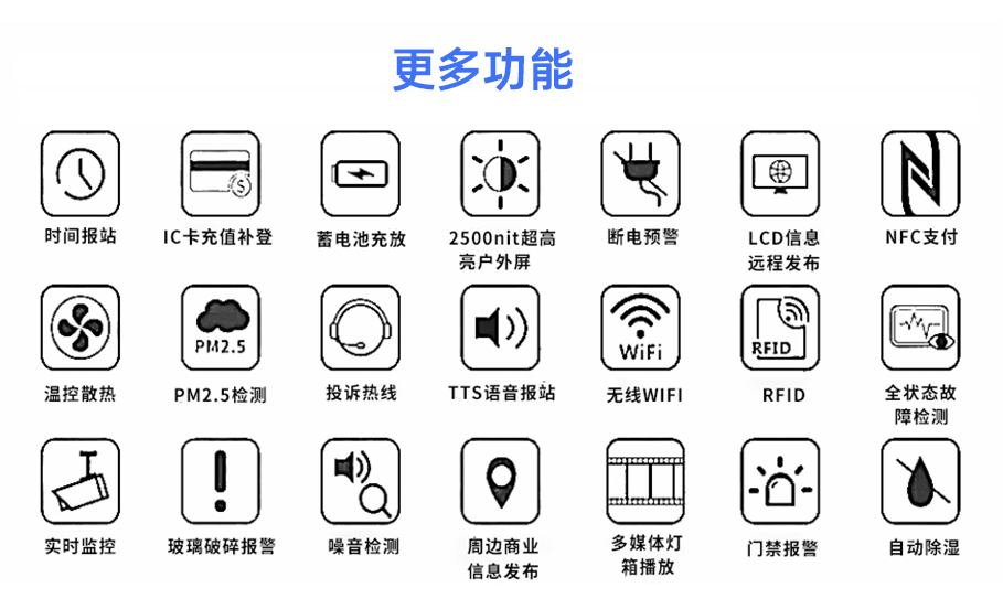 AR防眩光玻璃、LED灯光控制、断电告警、纳米触摸屏、IC卡电子圈存支付、RFID定位、NFC支付、摄像头、硬盘录像机、门禁传感器、温湿度传感器、PM2.5传感器、烟雾报警器、一键求救报警器、水浸传感器、震动传感器、玻璃破碎报警器、TTS语音播放模块。